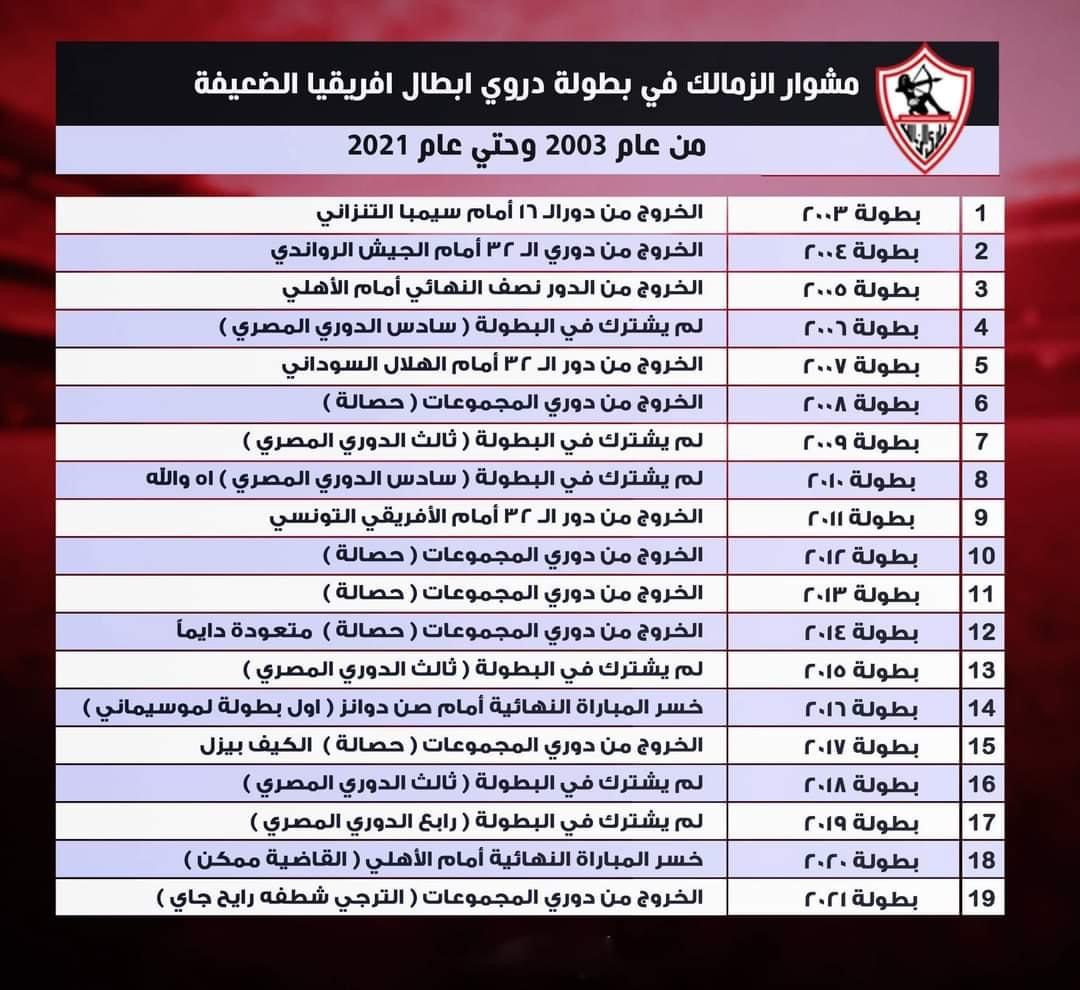 فشل: تاريخ خروج الزمالك في بطولة إفريقيا اخر ٢٠ سنة