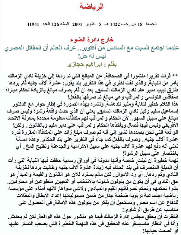 فساد: رشوة حكام مباراة السفاقسي 2001مقال للاستاذ ابراهيم حجازي بجريدة الاهرام النيابة تثبت رشوة حكام مباراة السفاقسي 2001 تحرير هذه الصفحةهل اعجبك محتوى الصفحة؟تساعدنا ملاحظاتك على تحسين محتوانا. المقال السابقتفويت مباراة المصري 1992المقال التاليتفويت مباراة المصري 1992
